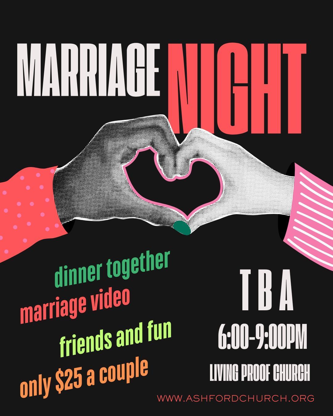 Marriage Night is going to be a fun night together for the couples in our Church! It’s gonna be like a double date, triple date, quadruple date….. you get the idea!